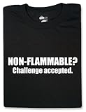 Here are some of the great features of Non-Flammable? Challenge Accepted T-shirt- "Non-flammable? Challenge accepted." in white ink on a black, 100% cotton t-shirt.