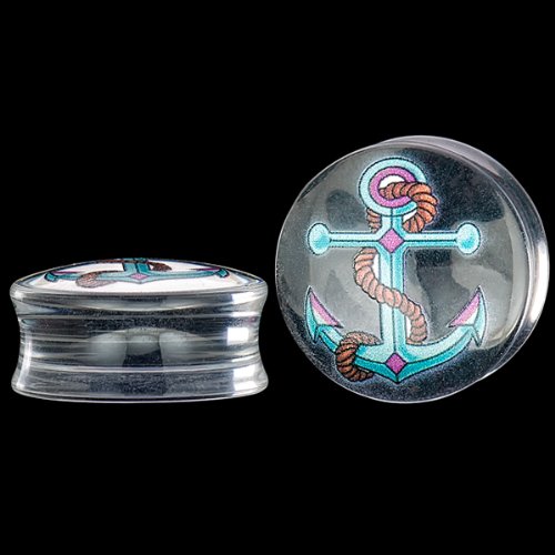Pair of 2 Gauge 6mm, The anchor, a symbol of safety and hope, decorates this nautical, double flared plug. The anchor's details are vivid against the glossy clear acrylic and create a beautiful contrast of color and high shine. Lightweight and durable, acrylic is also non-porous and easy to clean.
